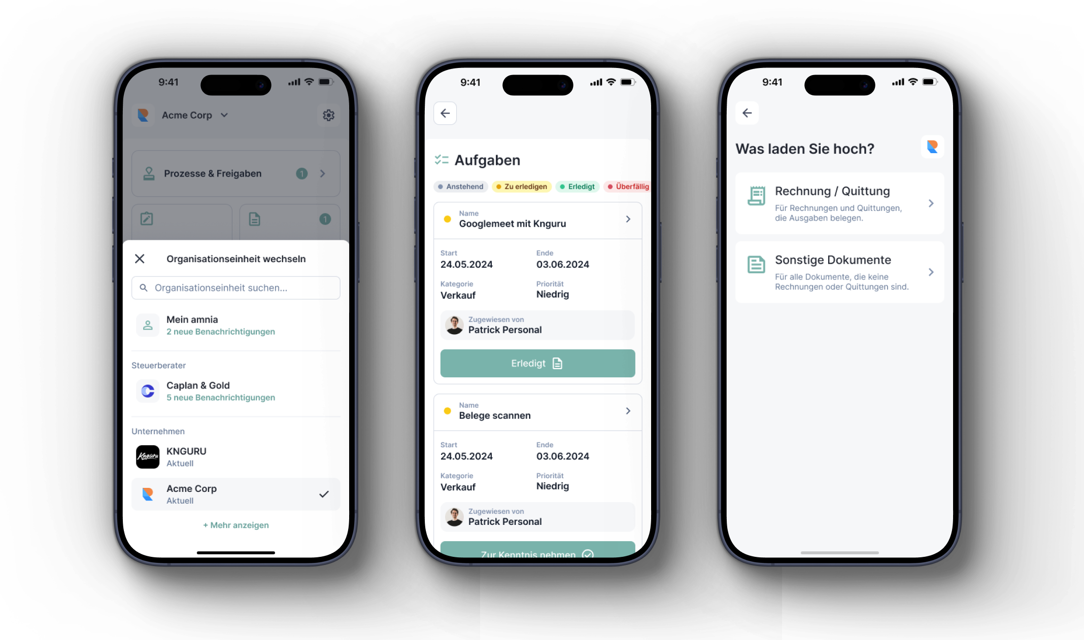 Sie benötigen keine zweite App und kein weiteres Gerät. Jede Organisation bleibt sauber getrennt, mit eigenen Prozessen, Dokumenten und Berechtigungen – und Sie behalten dennoch alles zentral im Blick.