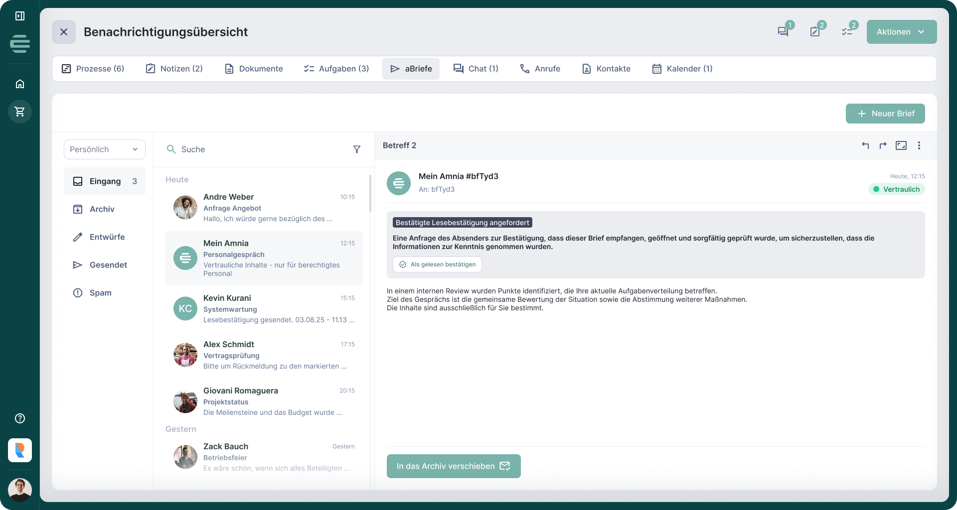 Ja. Alle Inhalte bleiben nachvollziehbar archiviert. Damitentsteht eine transparente Kommunikationshistorie – auch für spätere Prüfungenoder interne Übergaben.