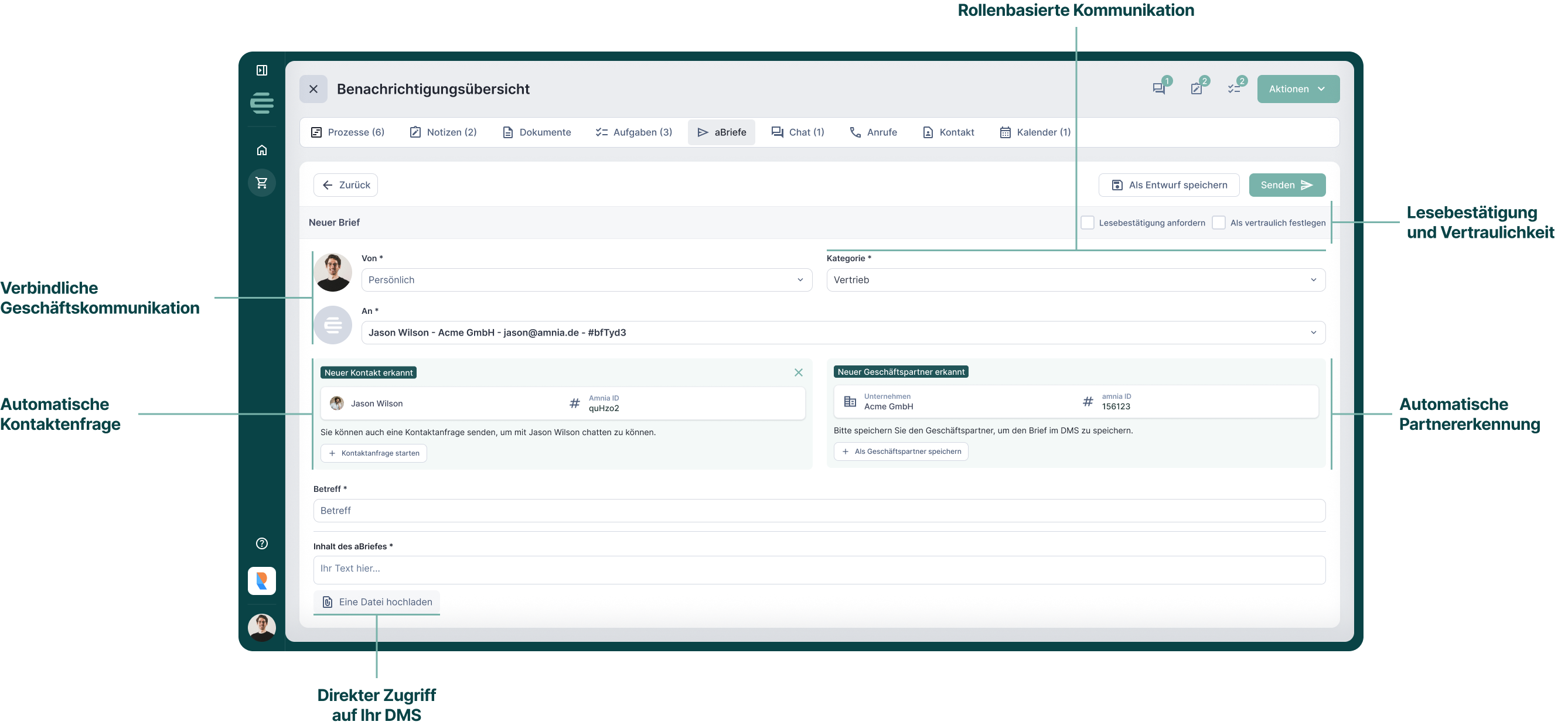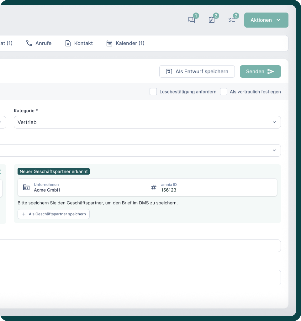 Ja. Zum Beispiel durch die automatische Erkennung neuer Geschäftspartner und die Übernahme relevanter Stammdaten, Hinweise bei Änderungen von Rollen oder Funktionen sowie die einfache Ablage von Dokumenten direkt im DMS. Und vieles mehr, das Ihre tägliche Kommunikation effizienter macht.